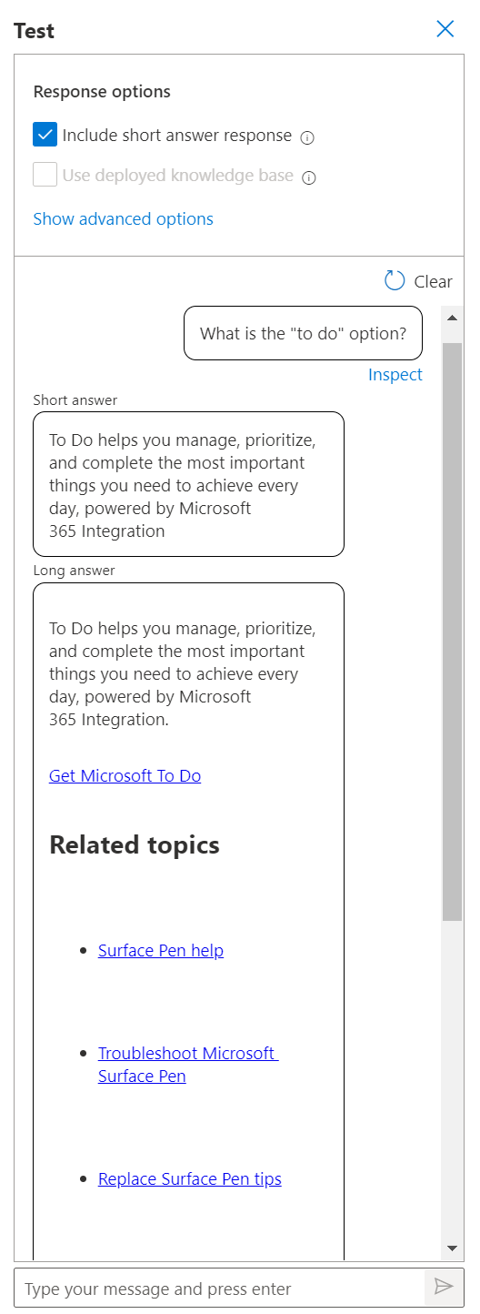 Ao inserir uma consulta no painel de teste, você poderá ver uma resposta curta junto com a passagem de resposta, se houver uma resposta curta presente na passagem de resposta.