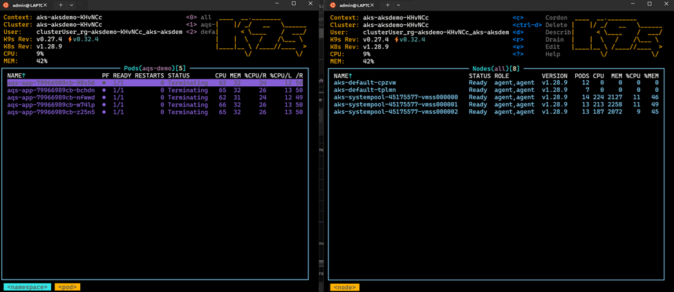 AQS_TARGET_NAMESPACE(o valor padrão éaqs-demo) e inicie o k9s em cada janela.Você deverá ver algo semelhante ao seguinte: