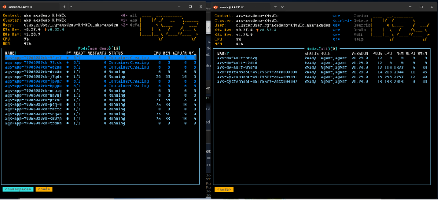 aks-defaultaumentou de um para três nós. Se você impedir que o aplicativo produtor coloque mensagens na fila, os consumidores vão acabar reduzindo a profundidade da fila abaixo do limite, e tanto o KEDA quanto o Karpenter reduzirão horizontalmente. Se você estiver usando o k9s, deverá ver algo assim:Por fim, você pode exibir a atividade de dimensionamento automático do Karpenter usando o comando