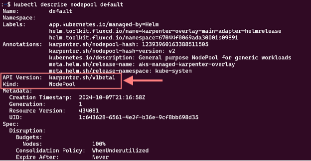 kubectl describe nodepool. Na resposta de comando, você pode verificar se o pool de nós é um pool de nós de Karpenter. Você deverá ver algo assim: