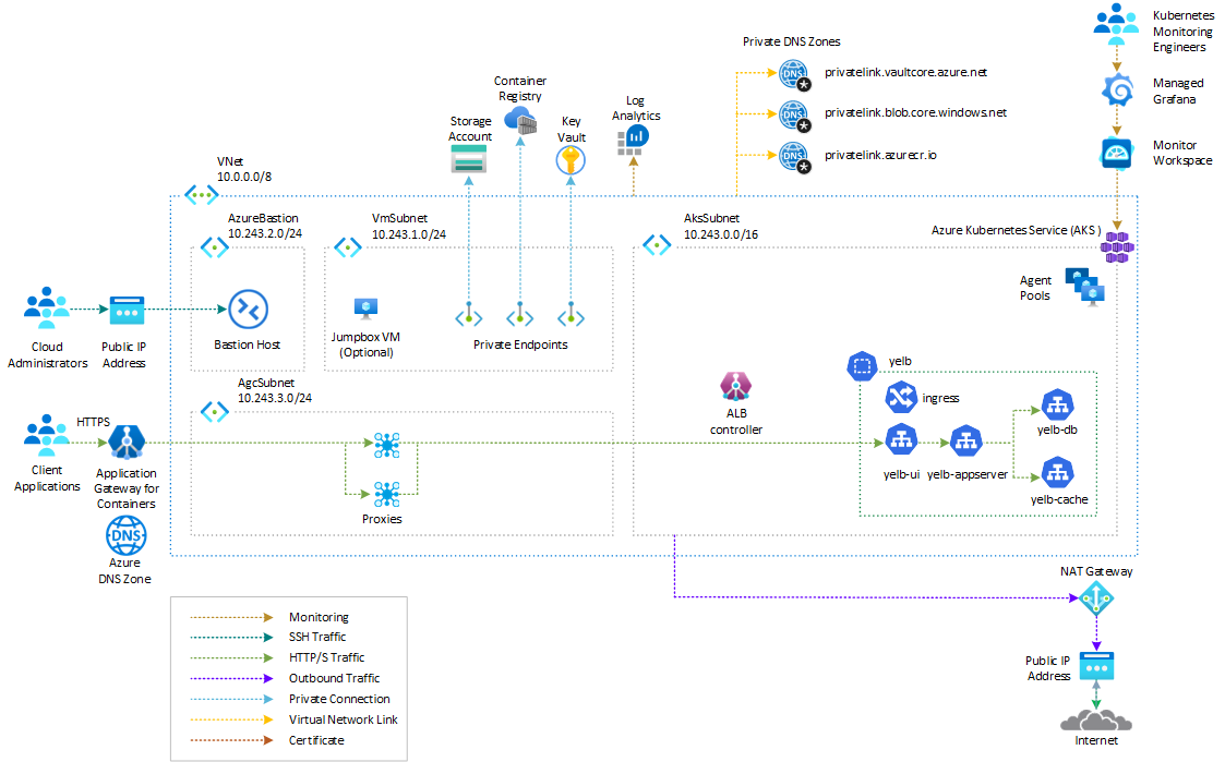 Para obter instruções abrangentes sobre como implantar o aplicativo Yelb no AKS usando essa arquitetura, consulte o exemplo complementar.
