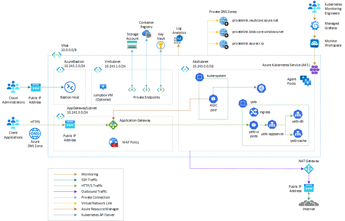 Nesta solução, o aplicativo Yelb é implantado em um cluster do AKS e é exposto por meio de um controlador de entrada como o controlador de entrada NGINX. O serviço do controlador de entrada é exposto por meio de um balanceador de carga interno (ou privado). Para obter mais informações sobre como usar um balanceador de carga interno para restringir o acesso aos seus aplicativos no AKS, consulte Usar um balanceador de carga interno com o AKS (Serviço de Kubernetes do Azure).