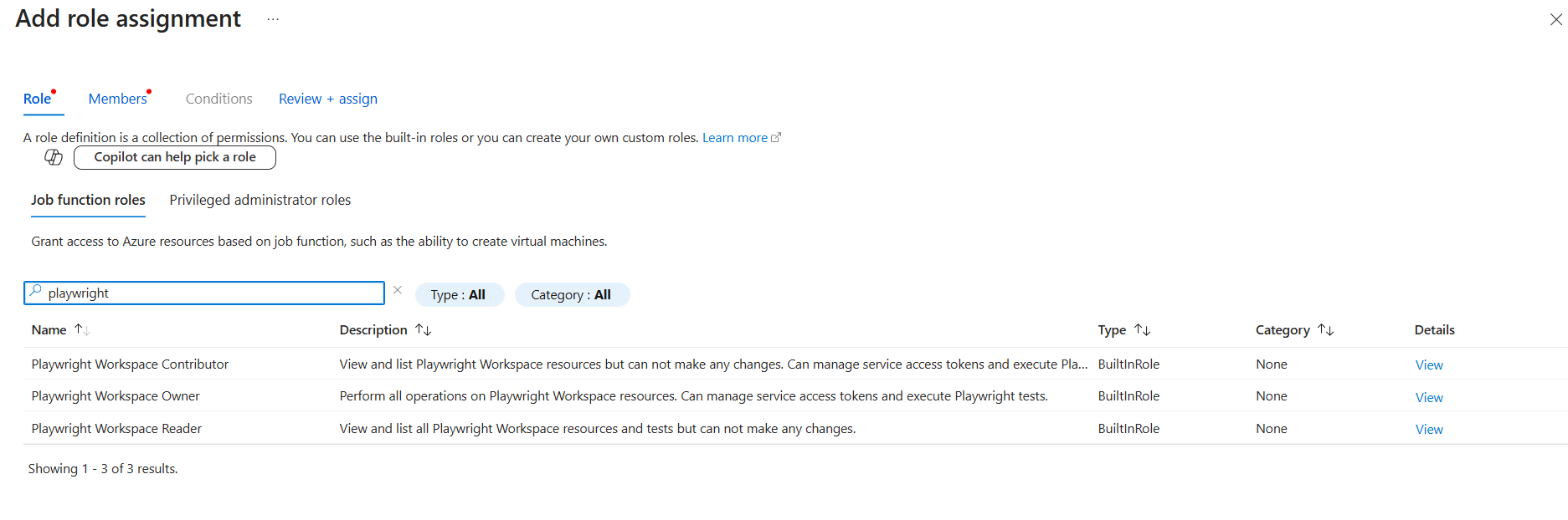| Playwright Workspace Reader | – Acesso somente leitura ao workspace no portal do Azure. - Exibir os resultados do teste para o workspace. - Não é possível criar ou excluir tokens de acesso ao workspace. - Não é possível executar testes de dramaturgo no serviço. |