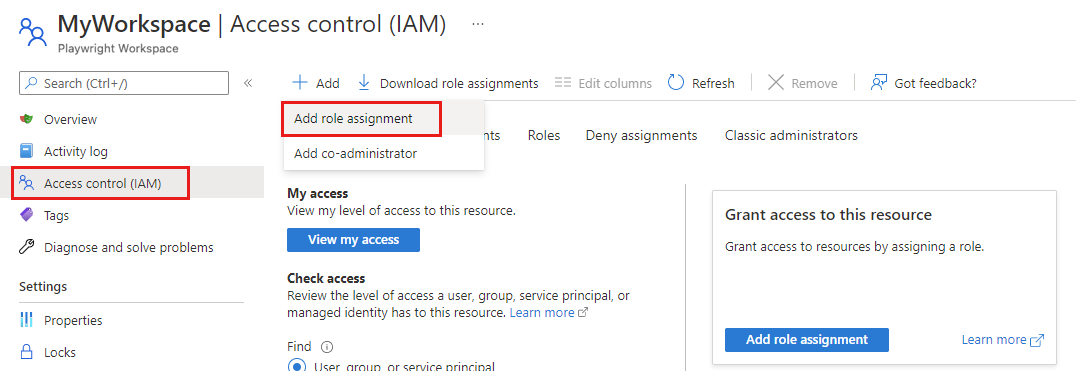 Neste artigo, você aprenderá como gerenciar o acesso a um espaço de trabalho no Playwright Workspaces. O serviço usa RBAC (controle de acesso baseado em função) do Azure para autorizar direitos de acesso ao seu workspace. Atribuições de função são a maneira de controlar o acesso aos recursos usando o RBAC do Azure.