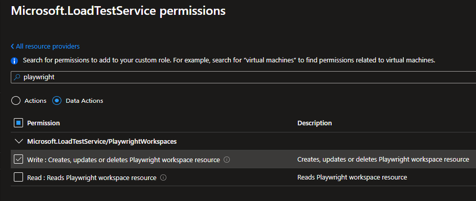 Microsoft.LoadTestService/PlaywrightWorkspaces/write, e, em seguida, selecione Adicionar.Siga essas etapas para adicionar uma atribuição de função para a função personalizada à conta de usuário.