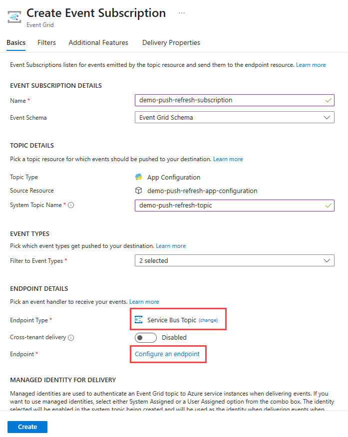 - Configure uma assinatura para enviar eventos de alteração de configuração do App Configuration para um tópico do Service Bus.