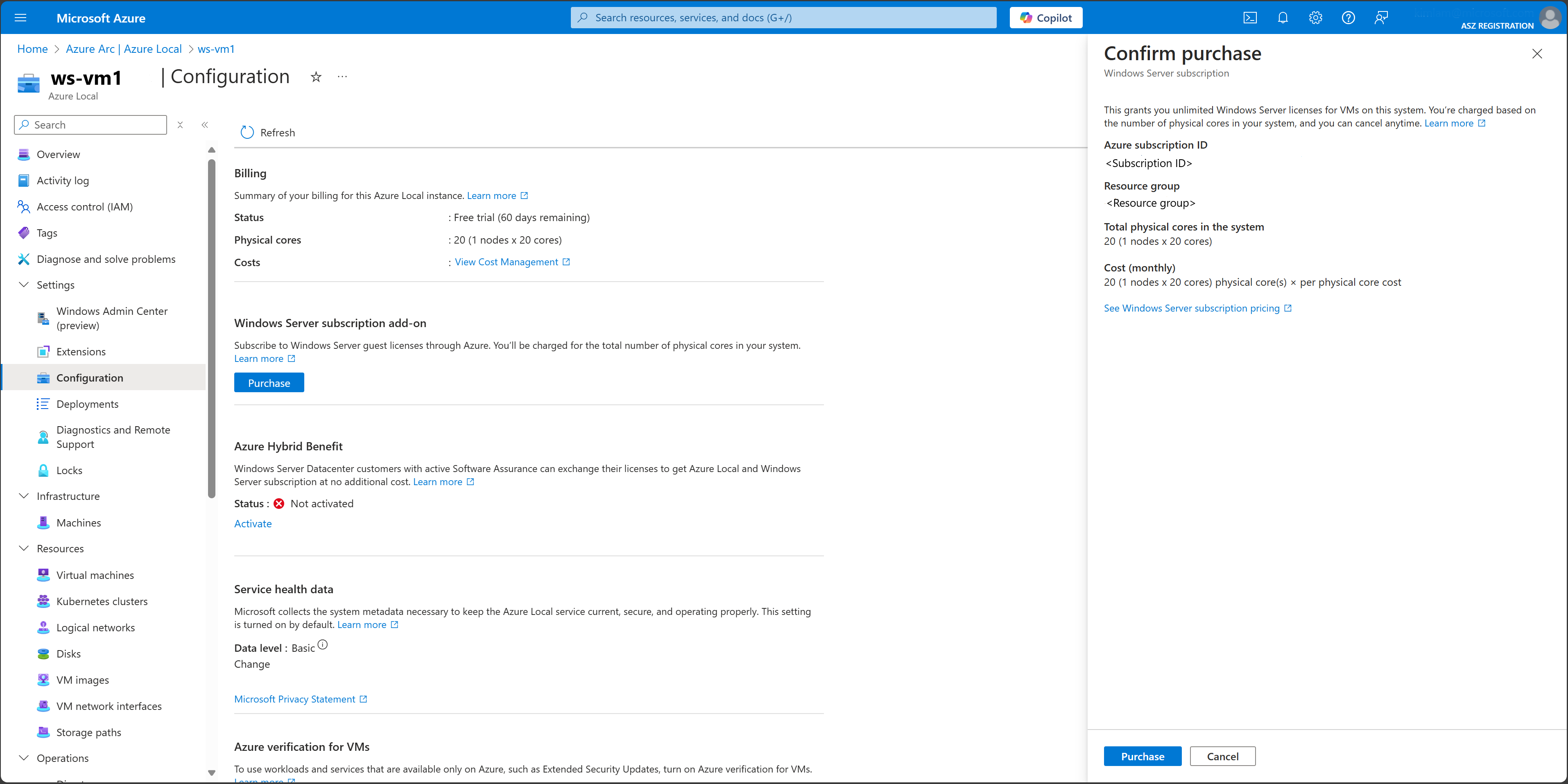 - Assinatura do Windows Server: Ativa todas as VMs do Windows Server no Azure Local. Disponível apenas para o Azure Local como um complemento.