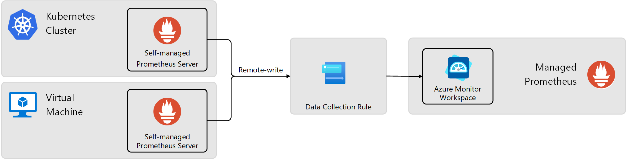 Remote_write é um recurso no Prometheus que permite enviar métricas de uma instância do Prometheus local para o armazenamento remoto ou para outra instância do Prometheus. Utilize este recurso para enviar métricas do Prometheus autogerenciado em execução em seu cluster Kubernetes ou máquinas virtuais para um espaço de trabalho do Azure Monitor usado pelo Managed Prometheus.