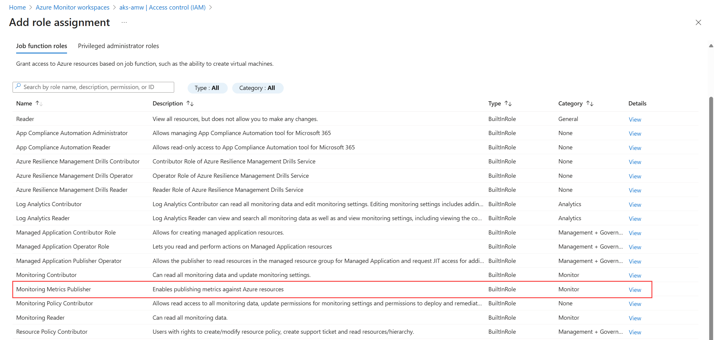 Escolha a função Publicador de Métricas de Monitoramento e, em seguida, selecione Próximo.