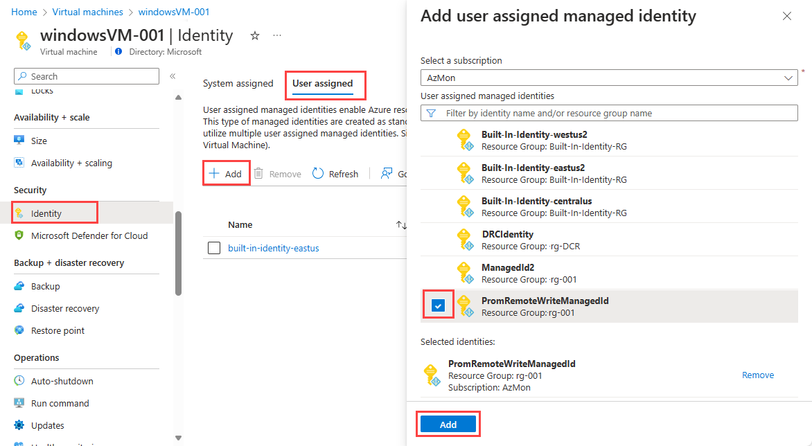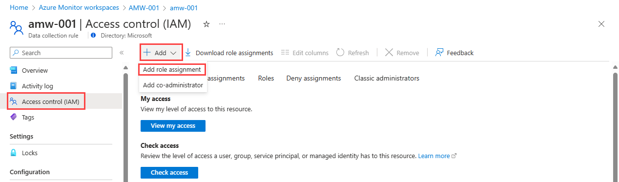 Depois que a identidade que você usará for criada, ela precisará receber acesso à DCR (regra de coleta de dados) associada ao workspace do Azure Monitor que receberá os dados por meio de gravação remota. Esse DCR é criado automaticamente quando você cria o workspace. Você especificará essa identidade na configuração de gravação remota para o cluster ou VM.