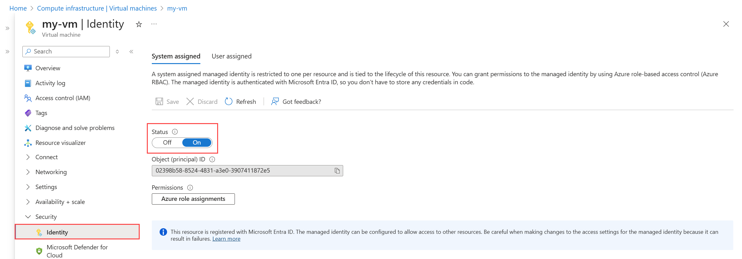 Você não cria diretamente uma identidade gerenciada atribuída pelo sistema, mas a habilita para uma máquina virtual do Azure ou um conjunto de dimensionamento de máquinas virtuais. Para uma VM do Azure, você pode habilitar a identidade ao criar a VM ou habilitá-la posteriormente em sua página identidade no portal do Azure. Para um VMSS, você deve habilitá-lo após a criação. Para obter as diferentes opções para habilitar a identidade gerenciada pelo sistema, consulte Configurar identidades gerenciadas em VMs (máquinas virtuais) do Azure e configurar identidades gerenciadas para recursos do Azure em um conjunto de dimensionamento de máquinas virtuais.
