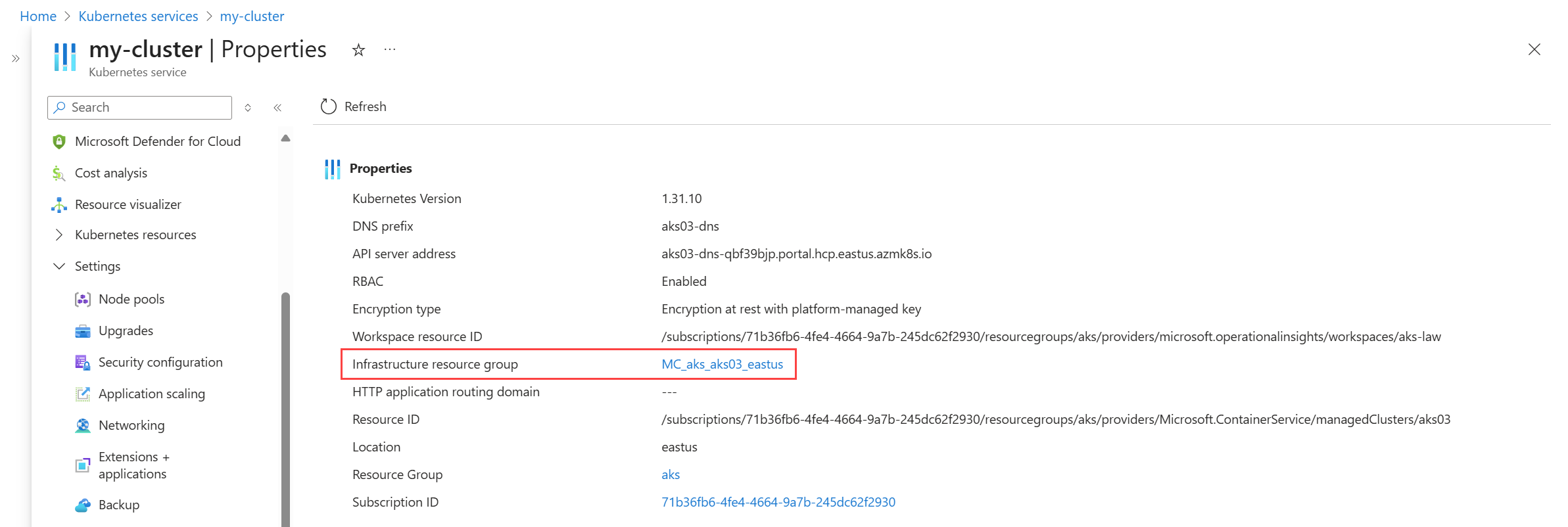Para um cluster AKS, a identidade gerenciada deve ser atribuída aos conjuntos de escalas de máquinas virtuais do cluster. O AKS cria um grupo de recursos que contém os conjuntos de dimensionamento de máquinas virtuais. Acesse esse grupo de recursos na página Propriedades no menu do cluster no portal Azure. Clique em Grupo de Recursos de Infraestrutura para exibir a lista de recursos neste grupo de recursos. Você deve habilitar a identidade gerenciada pelo sistema para cada conjunto de dimensionamento de máquinas virtuais no grupo de recursos.