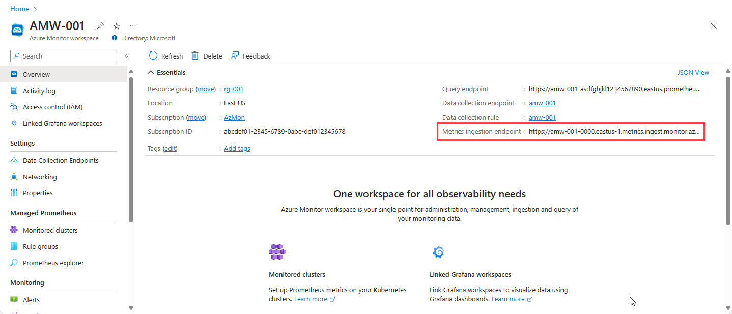 A gravação remota é configurada no arquivo prometheus.yml de configuração do Prometheus ou no Operador Prometheus. A etapa final é adicionar gravação remota ao arquivo de configuração para seu servidor Prometheus autogerenciado. Além dos detalhes da identidade que você criou, você também precisará do endpoint de ingestão de métricas (URL) para a área de trabalho do Azure Monitor. Obtenha esse valor na página Visão geral do workspace do Azure Monitor no portal do Azure e anote-o.