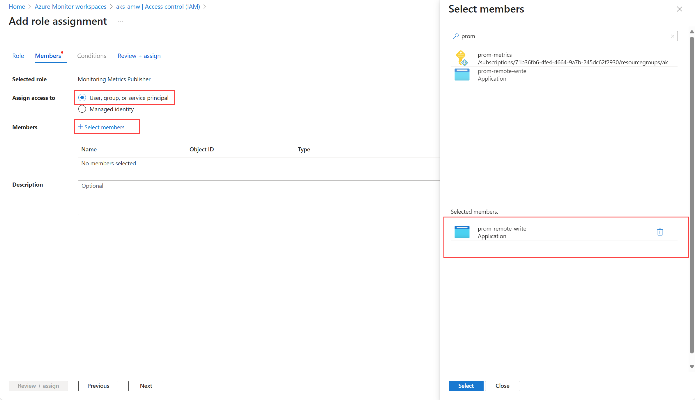 - Para a ID do Entra, selecione Usuário, grupo ou entidade de serviço e selecione membros. Selecione o aplicativo que você criou e escolha Selecionar.