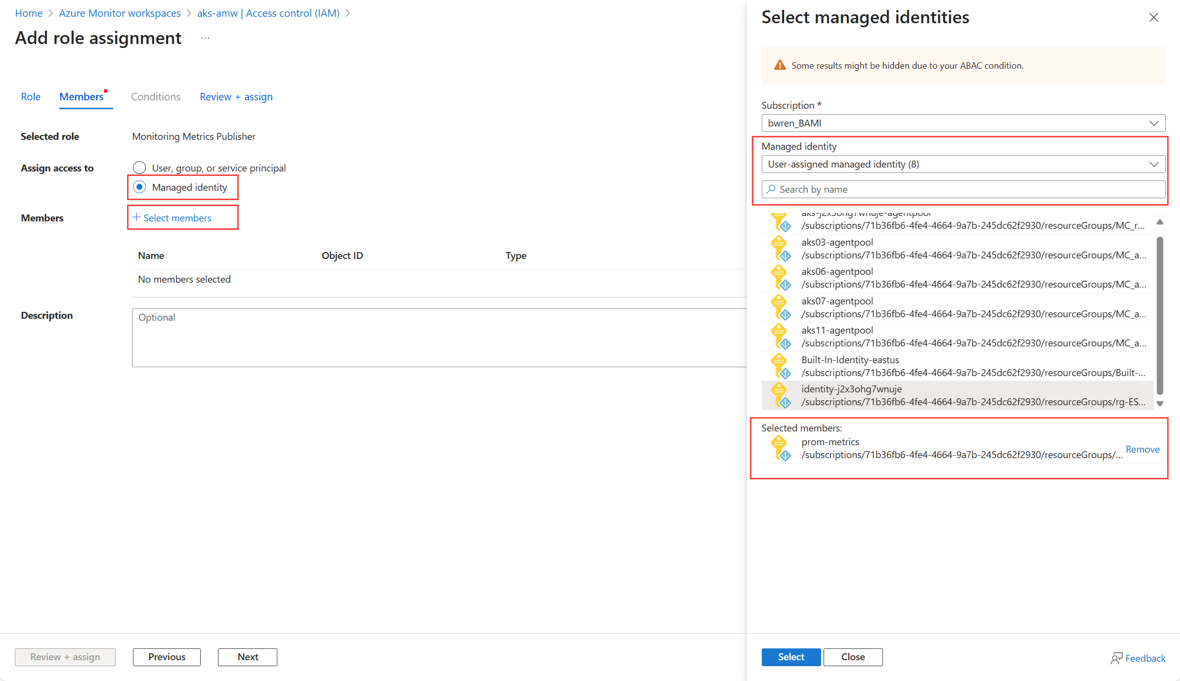 - Para a identidade gerenciada atribuída pelo sistema, selecione Identidade gerenciada e selecione membros. Na lista suspensa Identidade gerenciada, selecione a VM/VMSS ou cada VMSS no cluster do AKS.