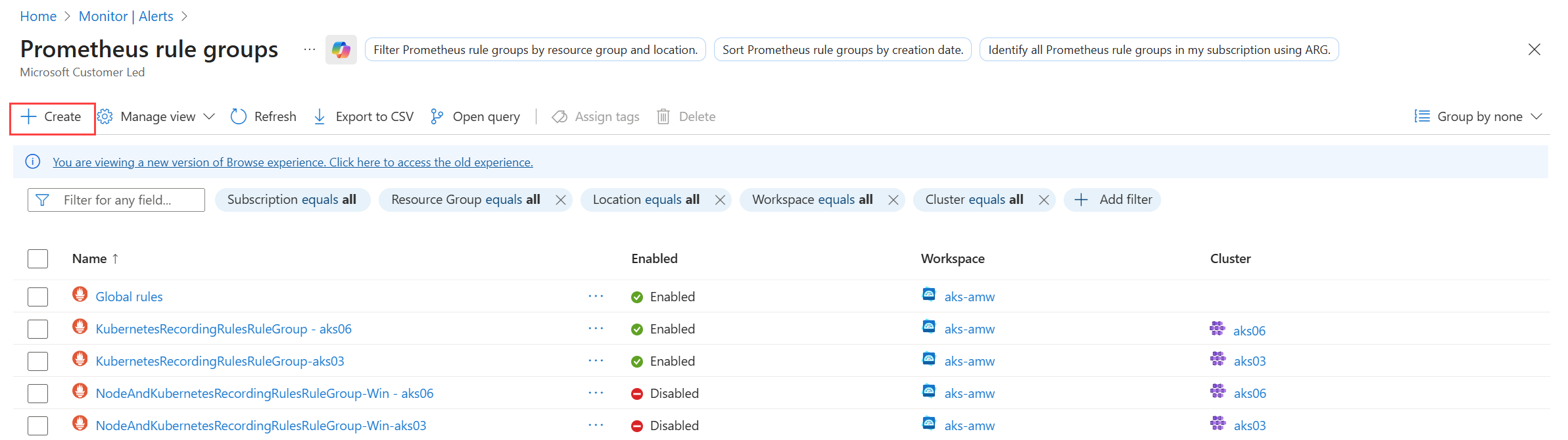 Há várias maneiras de exibir grupos de regras do Prometheus e suas regras no portal do Azure.