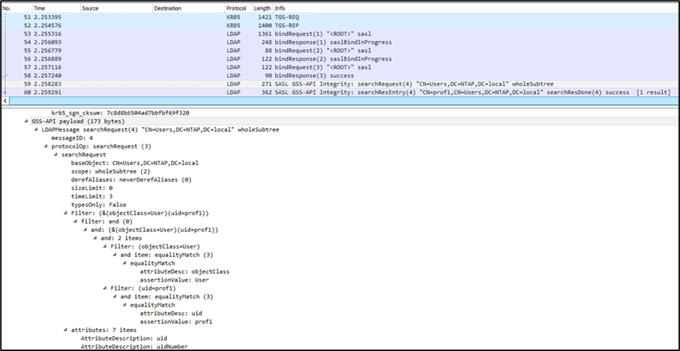 Ao usar Kerberos 5i (krb5i; verificação de integridade), um rastreamento mostra que os pacotes NFS não são criptografados, mas há um wrapper GSS/Kerberos adicionado ao pacote que exige que o cliente e o servidor garantam a integridade dos dados transferidos usando uma soma de verificação.