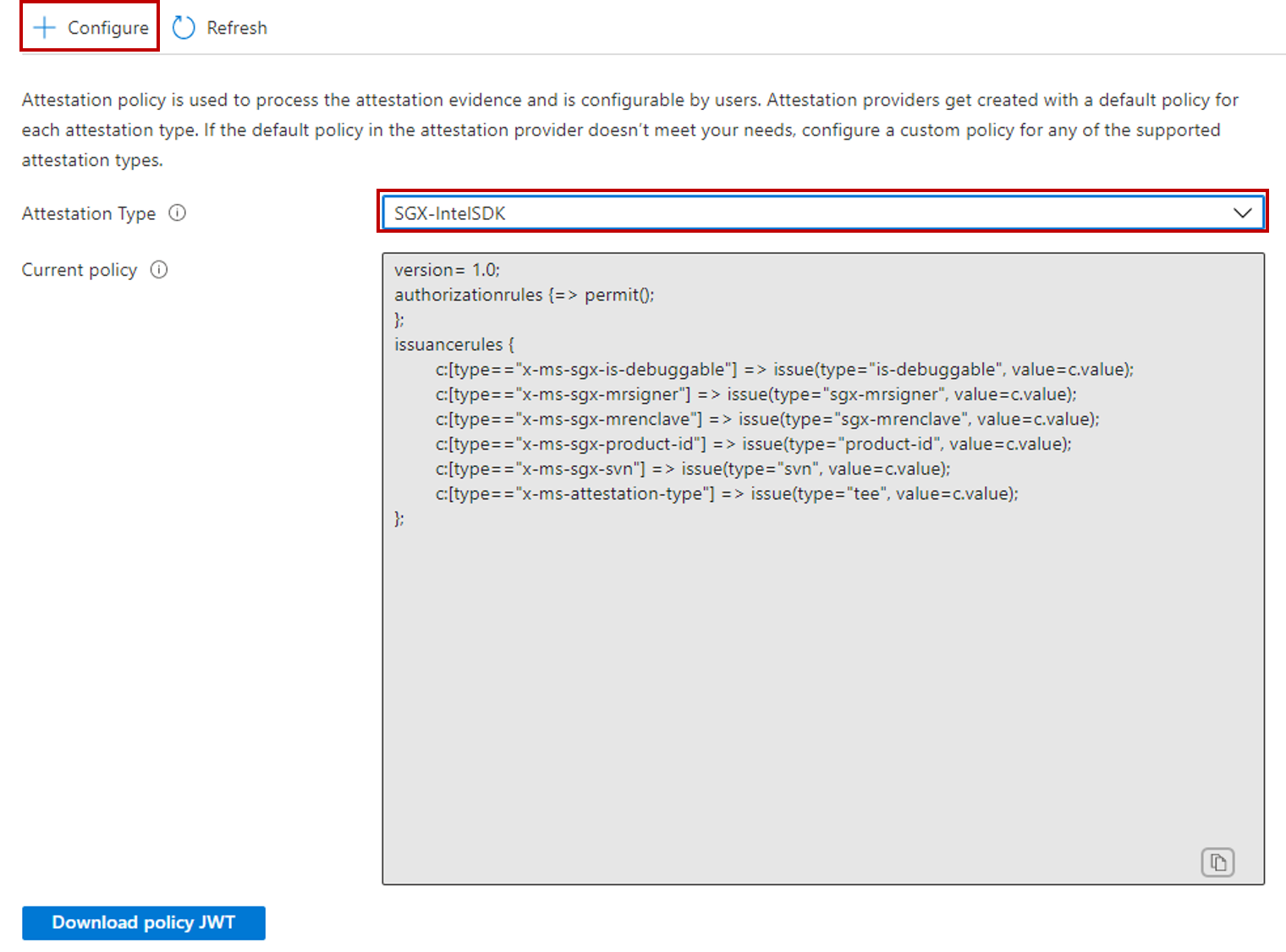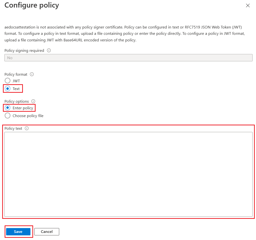 No campo Texto da política , substitua a política padrão pela política a seguir. Para obter mais informações, confira Criar e configurar um provedor de atestado.