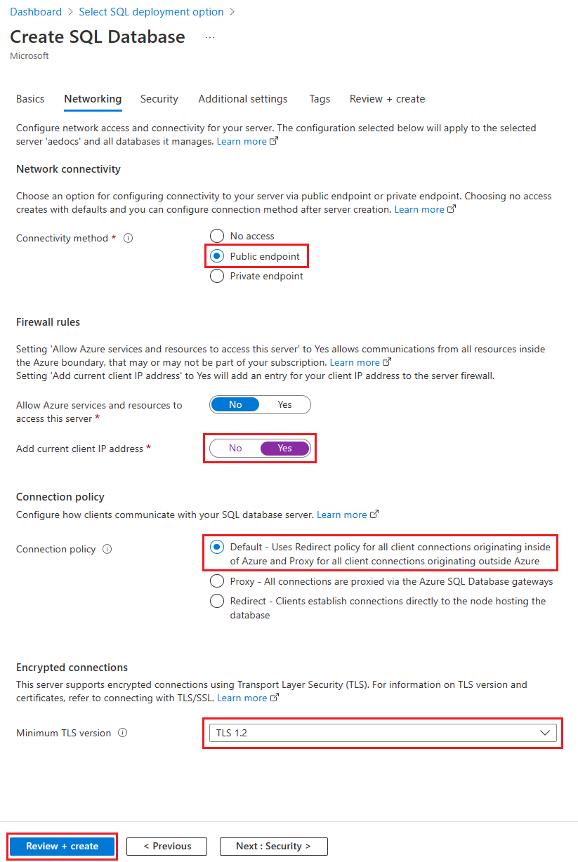 Para Regras de firewall, defina Adicionar endereço IP do cliente atual como Sim. Deixe Permitir que serviços e recursos do Azure acessem este servidor definido como Não.