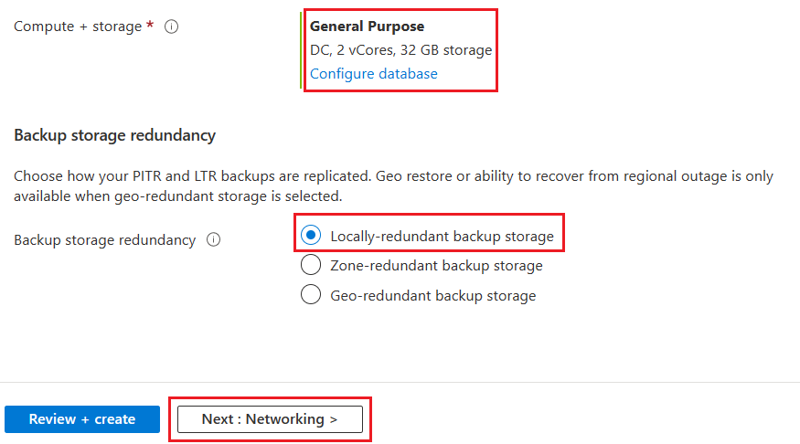De volta à guia Básico, verifique se Computação + armazenamento está definido como Uso geral, DC, 2 vCores, 32 GB de armazenamento.