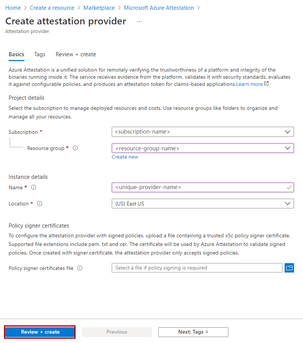 Na página Criar provedor de atestado, forneça as seguintes entradas: