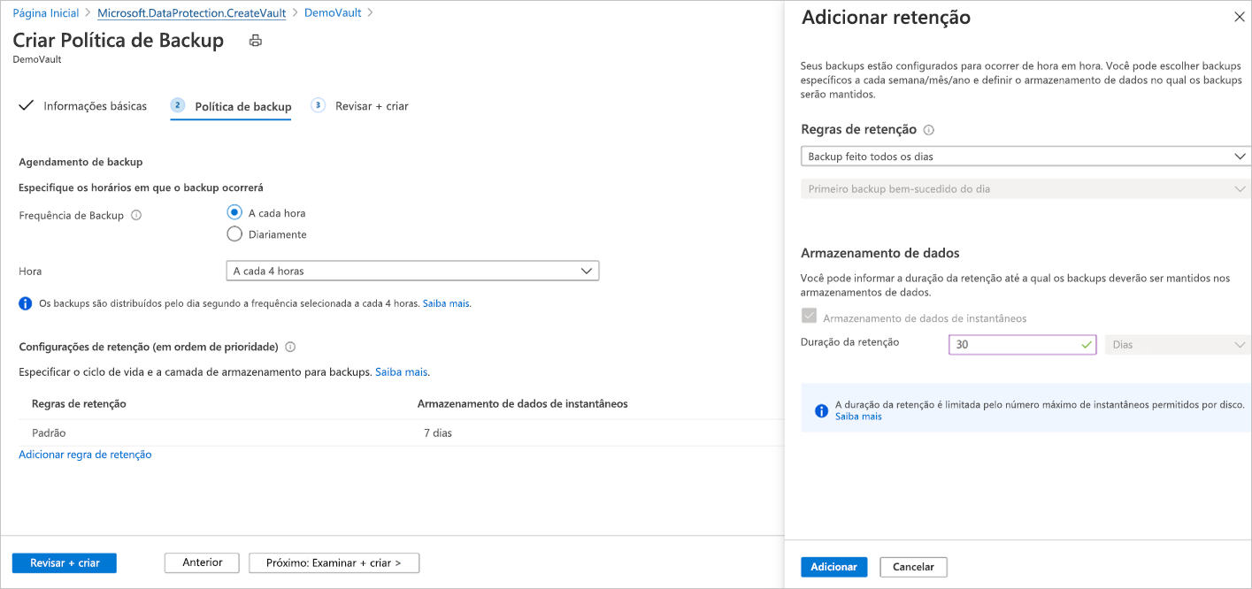 Você pode definir um limite máximo de retenção de 1 ano ou 450 instantâneos de disco, o que for atingido primeiro. Por exemplo, se você optou por uma frequência de backup de 12 horas, pode manter cada ponto de recuperação por no máximo 225 dias, pois o limite de instantâneo será violado além disso.