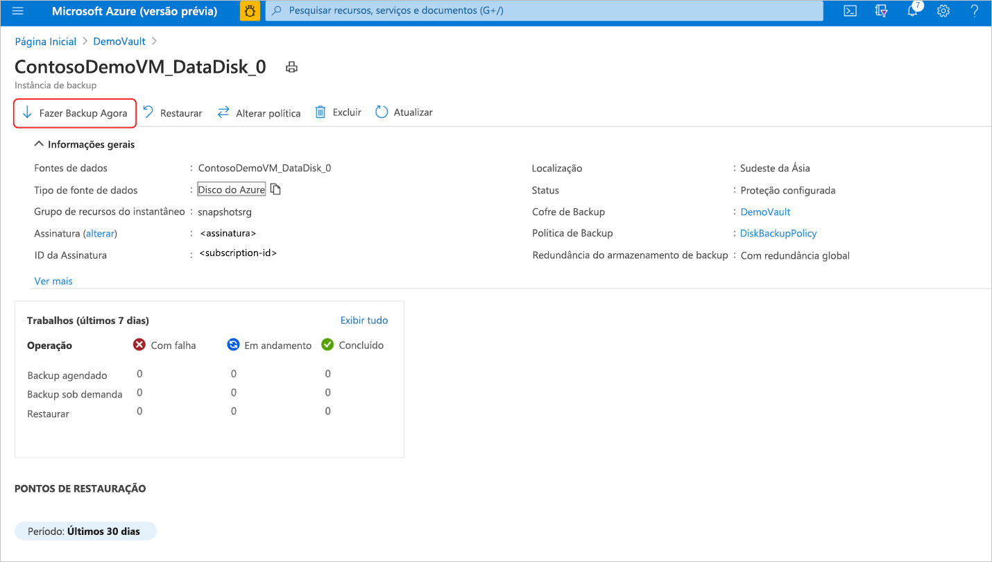 Embora o cofre selecionado possa ter a configuração de redundância global, o backup no Disco do Azure dá suporte apenas ao armazenamento de dados de instantâneos. Todos os backups são armazenados em um grupo de recursos na assinatura e não são copiados para o armazenamento do cofre de backup.