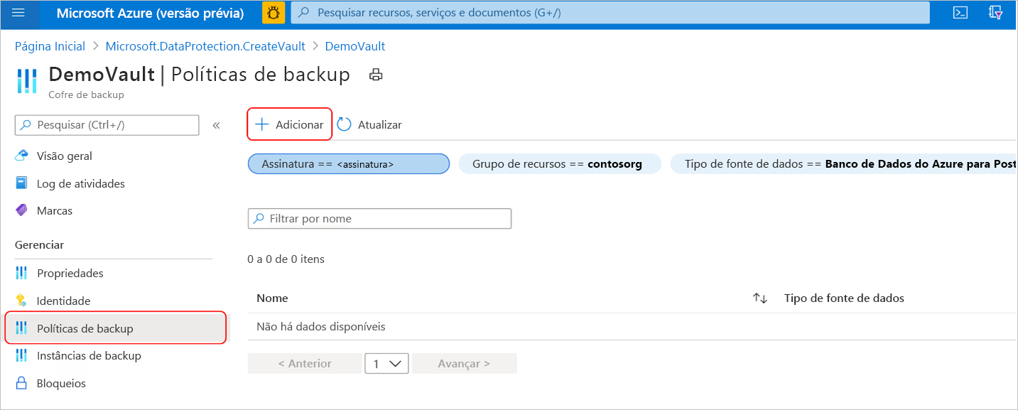 No Cofre de backup, vá para Políticas de backup e selecione Adicionar.