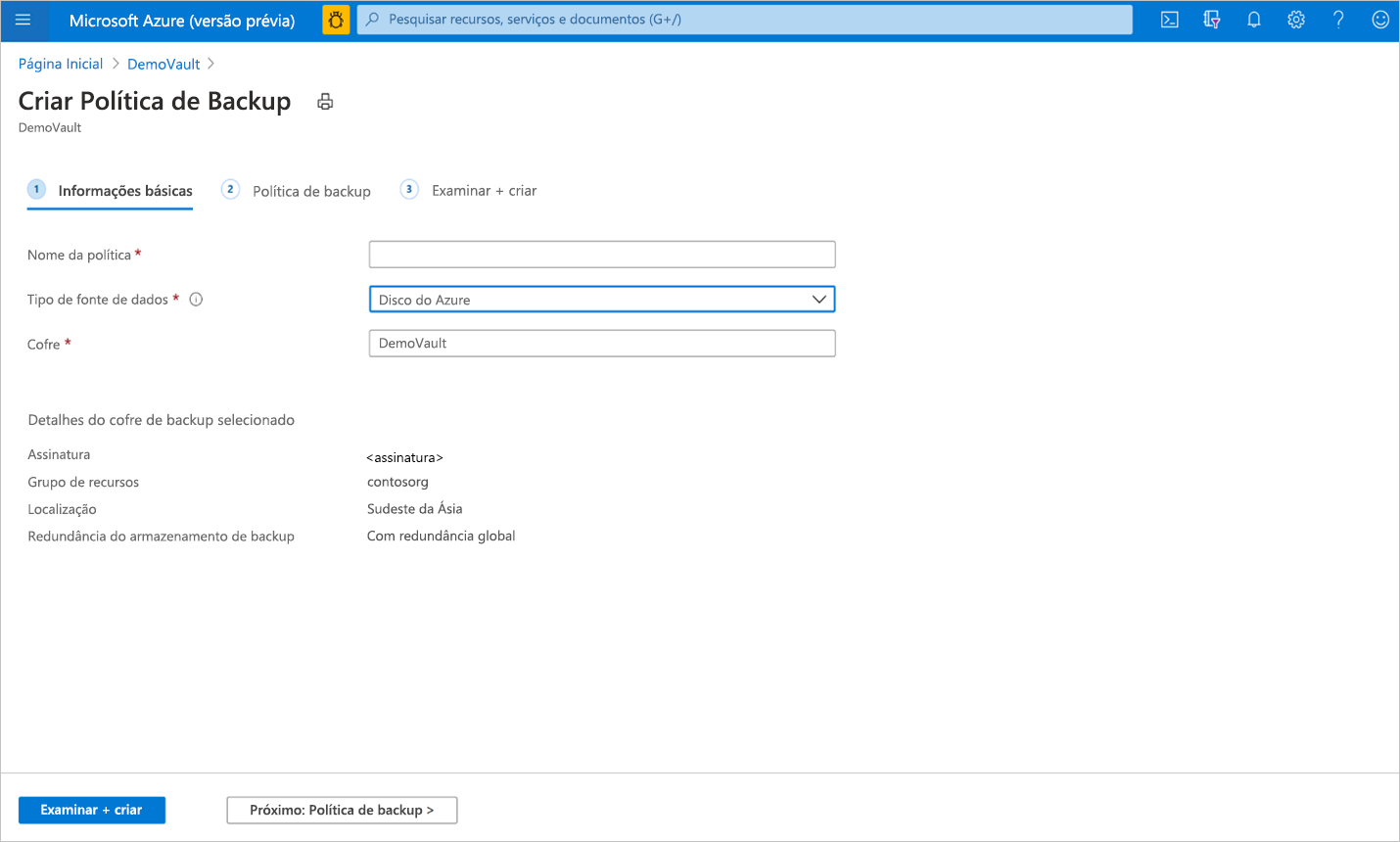 Na guia Básico, forneça o nome da política, selecione o Tipo de fonte de dados como Disco do Azure. O cofre já foi preenchido previamente e as propriedades do cofre selecionado são apresentadas.