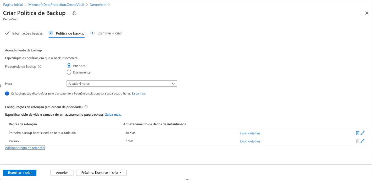 Na guia Política de backup, selecione as configurações de retenção que atendem ao requisito de RPO (objetivo de ponto de recuperação).