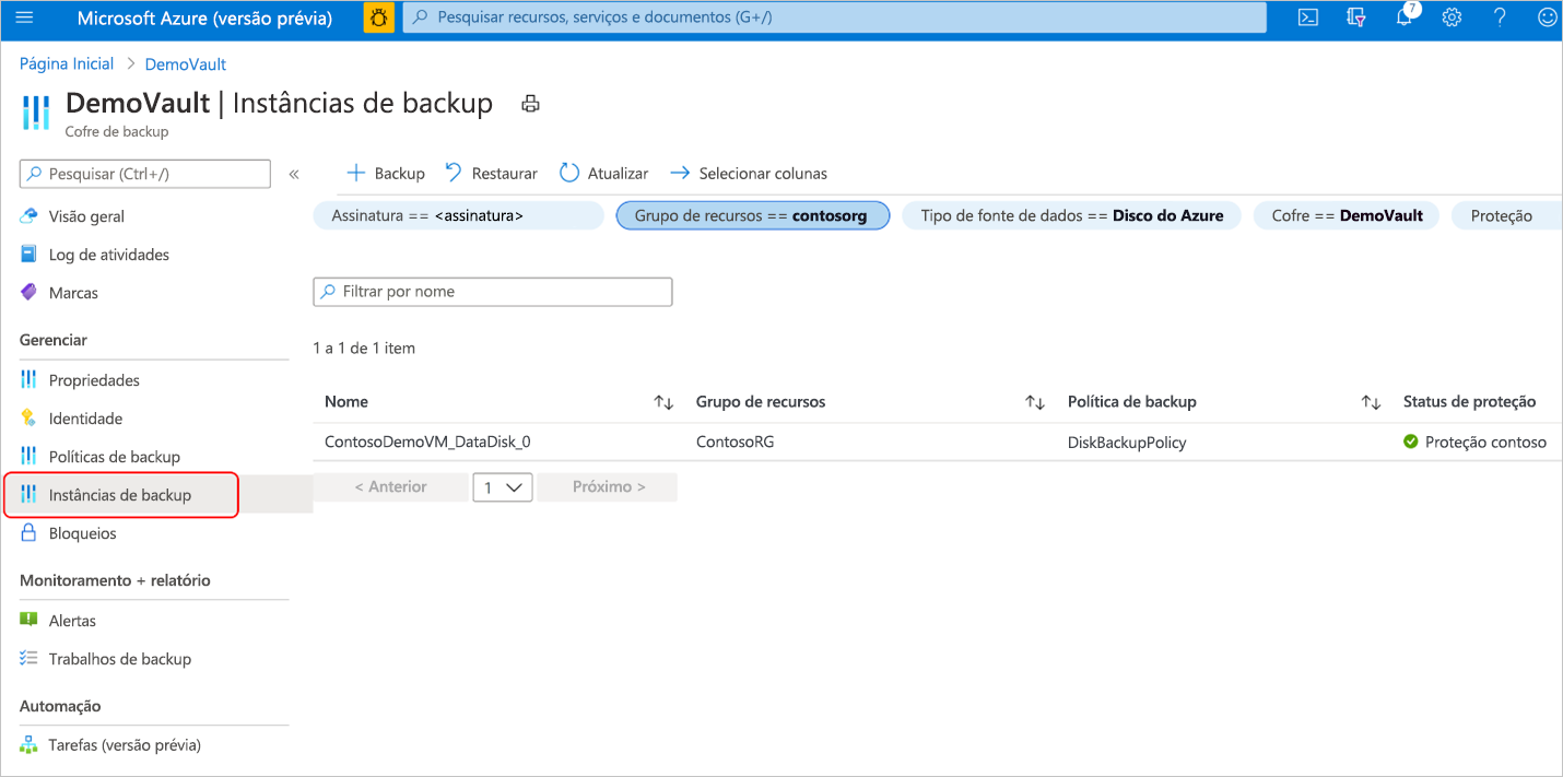 No Cofre de backup, vá para Instâncias de backup e selecione uma instância de backup.