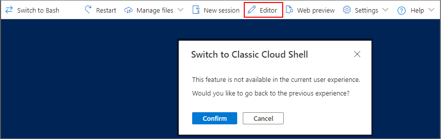 O editor do Cloud Shell é um editor de texto baseado em navegador otimizado para gerenciamento e edição. O editor usa a interface do usuário Clássica. Quando você seleciona o botão Editor, o Cloud Shell exibe um formulário de confirmação antes de alternar para a experiência do usuário Clássica. Selecione o botão Confirmar para continuar.