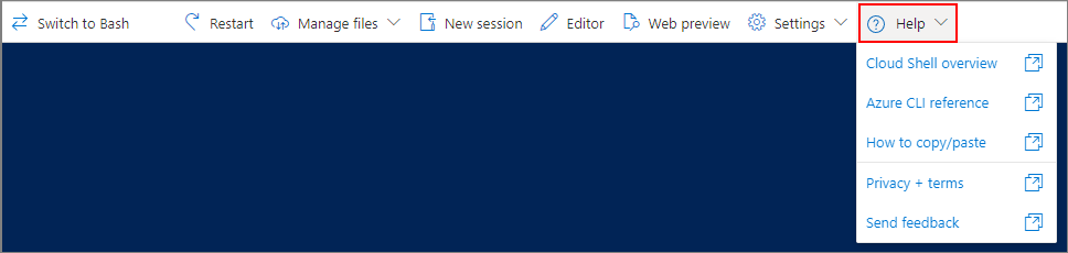 O menu Ajuda contém links para o Cloud Shell e outra documentação relacionada e o formulário de comentários do Cloud Shell.