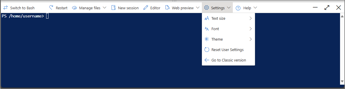 Quando você seleciona Ir para a versão clássica, o Cloud Shell reinicia a sessão na versão clássica da experiência do usuário. Para obter uma descrição da versão clássica de experiência do usuário, consulte Como usar a janela do Azure Cloud Shell.