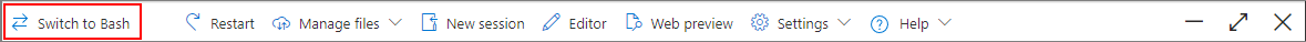 Use o seletor de ambiente na barra de ferramentas do Cloud Shell para alternar entre os ambientes do Bash e do PowerShell. Quando o Cloud Shell está configurado para iniciar no PowerShell, o botão é rotulado Alternar para o Bash. Quando o Cloud Shell está configurado para iniciar no Bash, o botão é rotulado Alternar para o PowerShell.