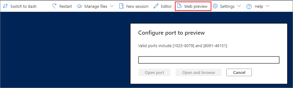 O recurso visualização da Web permite que você abra portas no contêiner do Cloud Shell para se comunicar com aplicativos em execução. O menu de visualização da Web permite que você insira o número da porta que deseja abrir.