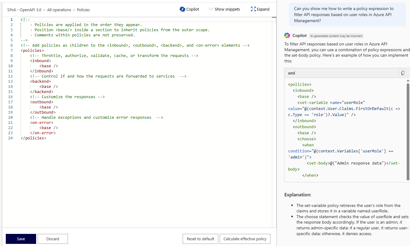Ao criar uma política de Gerenciamento de API, você pode dizer "Você pode me mostrar como escrever uma expressão de política para filtrar respostas de API com base em funções de usuário no Gerenciamento de API do Azure?". O Azure Copilot gera uma política e explica como ela funciona.