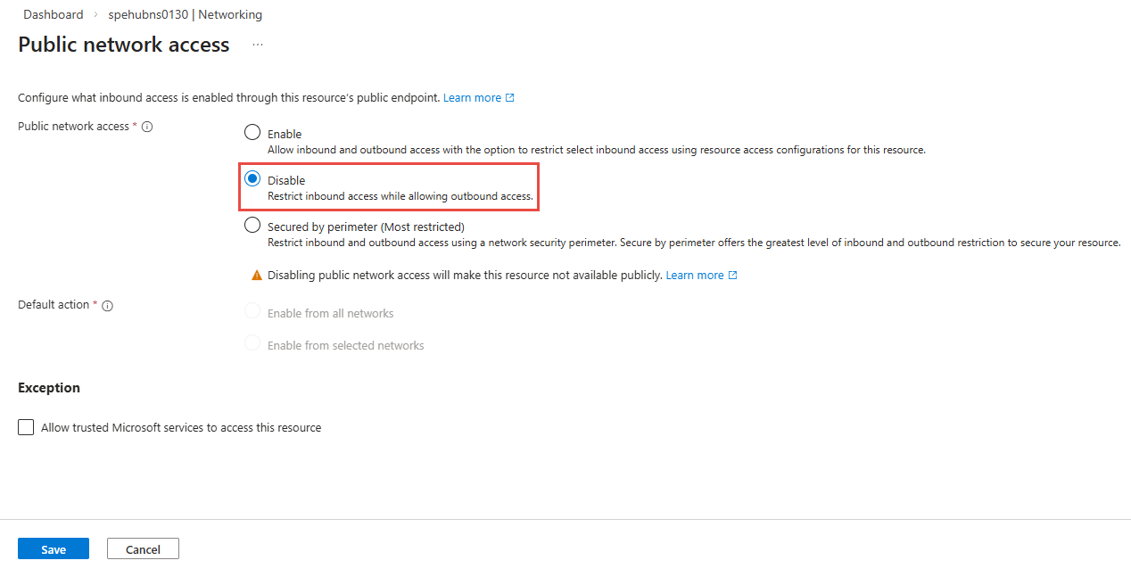 Desabilite o acesso público ao namespace dos Hubs de Eventos para permitir o acesso somente por meio de pontos de extremidade privados.