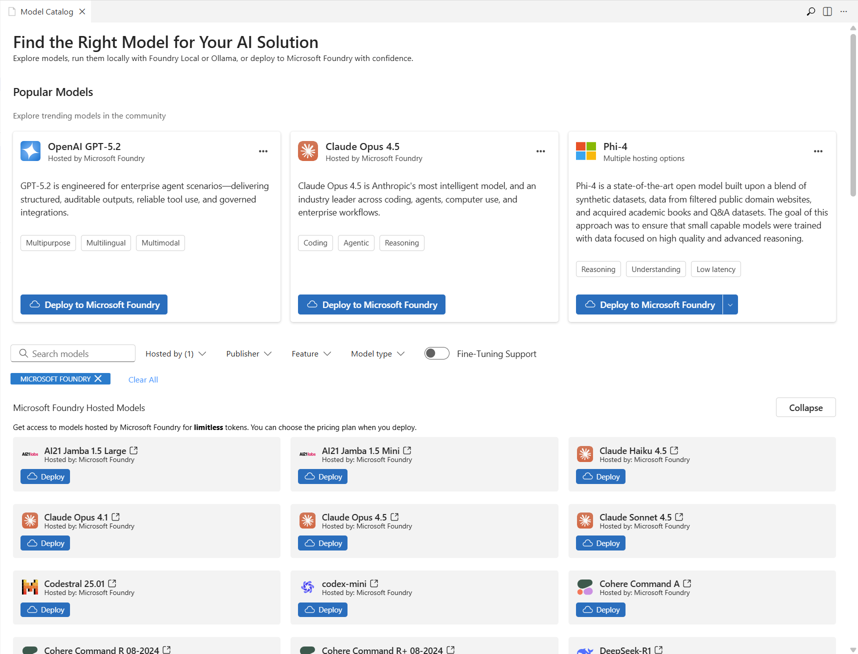 O catálogo de modelos fornece acesso a modelos da Microsoft, OpenAI, Meta, DeepSeek e outros provedores. Você pode abrir o catálogo de modelos de várias maneiras:
