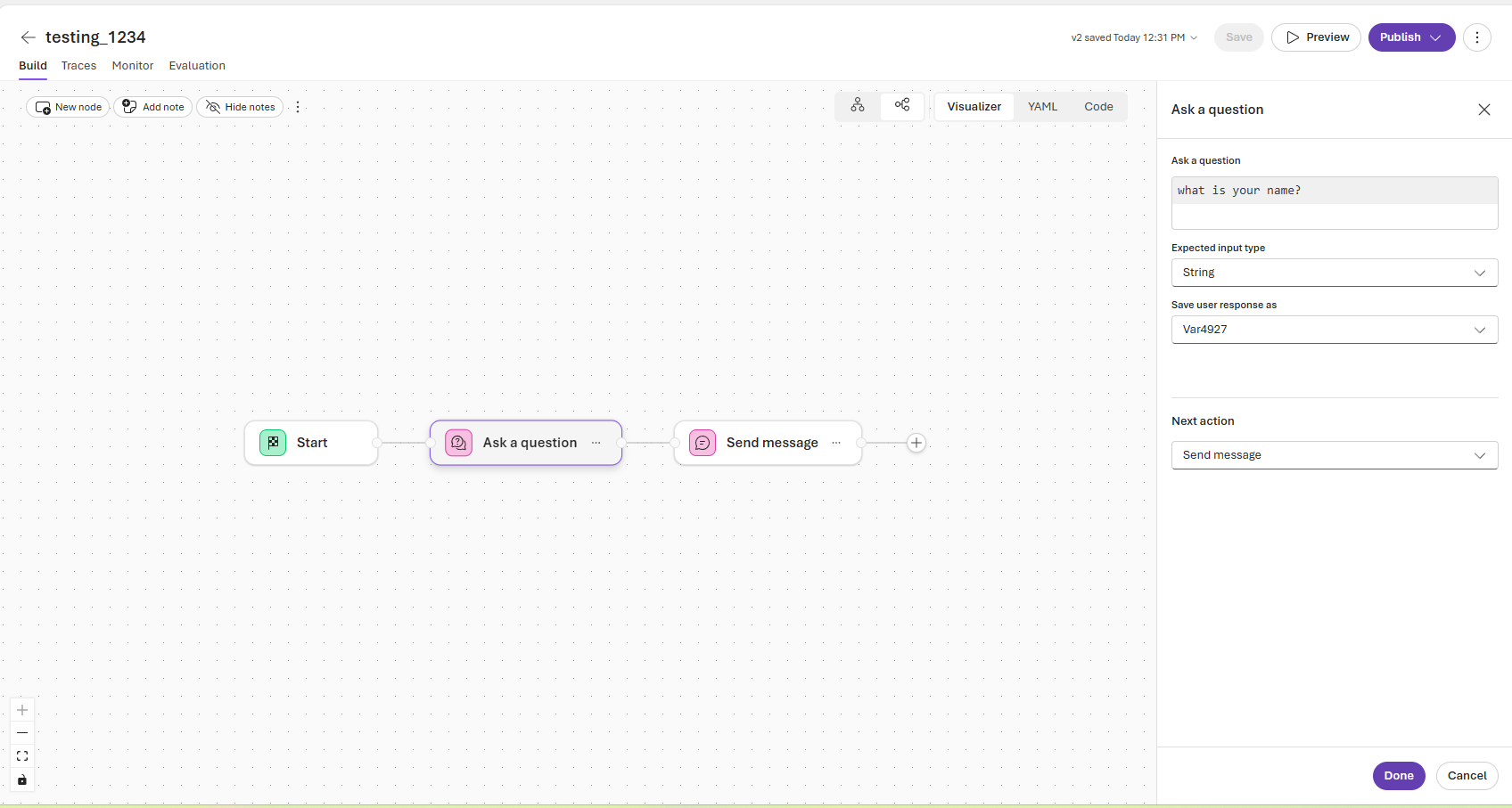 Crie um fluxo de trabalho e adicione um nó de Fazer uma pergunta.