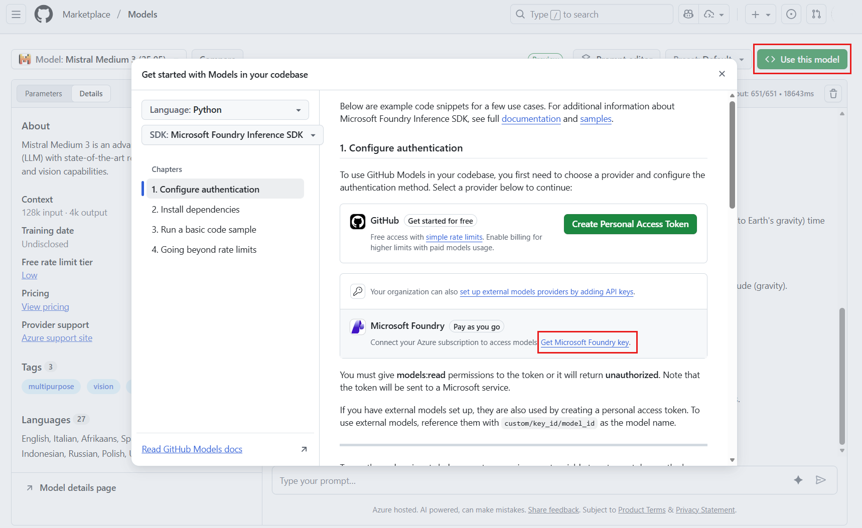 Vá para Modelos do GitHub e selecione um modelo para acessar seu playground. Este artigo usa o Mistral Medium 3 (25.05).