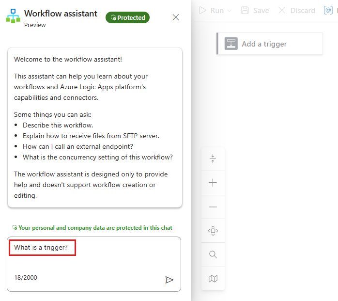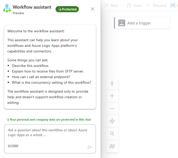 O assistente de fluxo de trabalho não coleta, salva, armazena ou compartilha dados pessoais ou do cliente em seus fluxos de trabalho do aplicativo lógico Standard ou em qualquer informação em seu histórico de chat. Você pode abrir o assistente somente no designer para fluxos de trabalho Standard no portal do Azure, não no Visual Studio Code.