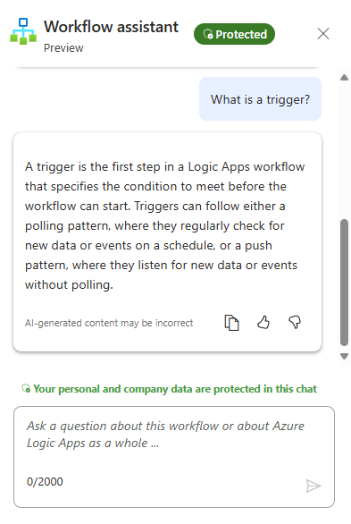 Na caixa de chat, insira sua pergunta sobre o fluxo de trabalho atual ou sobre os Aplicativos Lógicos do Azure.