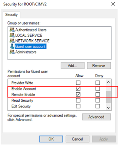 A conta de usuário convidado precisa de permissão para acessar o namespace CIMV2 e seus sub-namespaces no item controle WMI no Painel de Controle. Para definir o acesso, use as seguintes etapas: