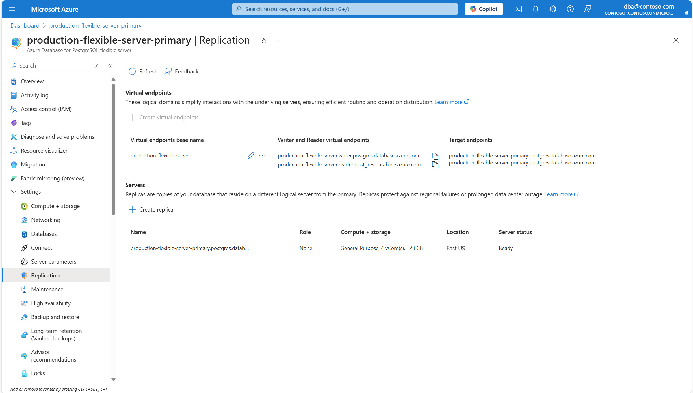 Captura de tela mostrando a página de Replicação com pontos de extremidade virtuais criados.