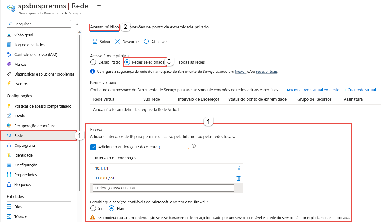 Se você selecionar a opção Redes selecionadas e não adicionar pelo menos uma regra de firewall IP ou uma rede virtual nessa página, o namespace poderá ser acessado através de Internet pública (usando a tecla de acesso).