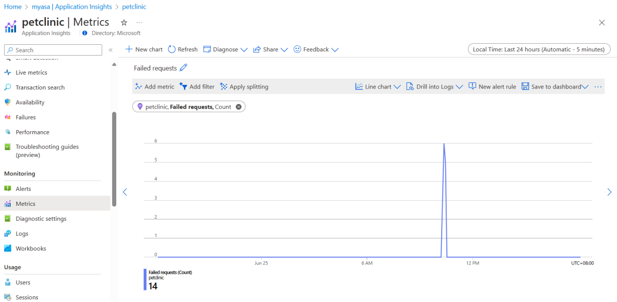 Para fixar o gráfico "Solicitações com falha", use as etapas da seção Fixar o gráfico "Disponibilidade". A métrica Solicitações com falha está no namespace de Métricas padrão do Application Insights.