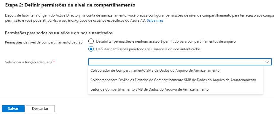 Depois de habilitar uma origem do AD, a Etapa 2: Definir permissões no nível do compartilhamento estará disponível para configuração. Selecione Habilitar permissões para todos os usuários e grupos autenticados.