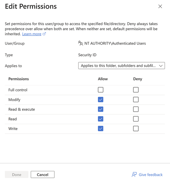 Usar o Explorador de Arquivos do Windows não funciona para identidades somente na nuvem. Se o cliente não estiver ingressado no domínio ou se o ambiente tiver várias florestas do AD, não use o Windows Explorer para configurar ACLs. Em vez disso,use icacls. Essa restrição existe porque a configuração de ACL do Explorador de Arquivos do Windows requer que o cliente esteja associado ao domínio do AD ao qual a conta de armazenamento está vinculada.