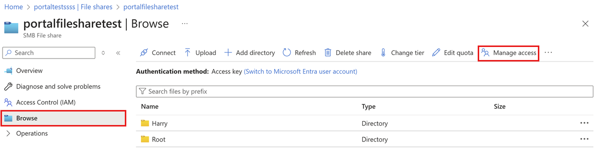 No menu de serviço, selecione Procurar. Se você quiser definir uma ACL na pasta raiz, selecione Gerenciar acesso no menu superior.